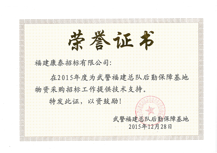 武警福建總隊(duì)后勤保障基地授權(quán)榮譽(yù)證書(shū)